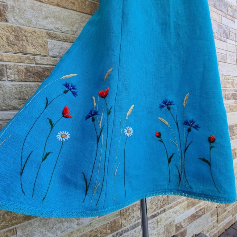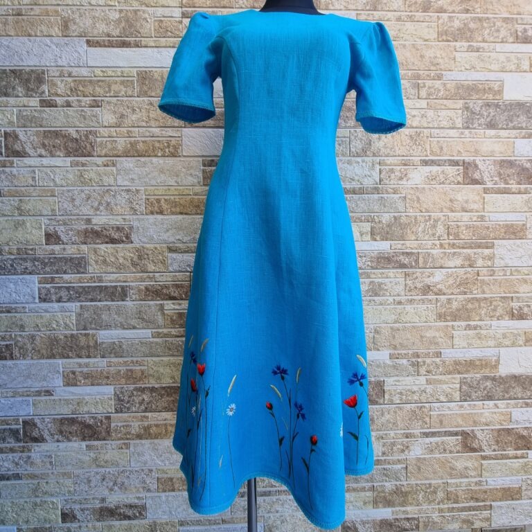 Türkiissinine linane käsitöö tikandiga kleit suurus XS