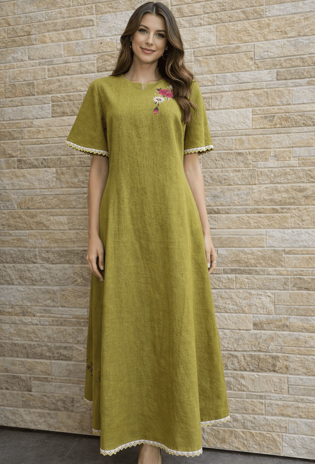 Hele samblaroheline käsitöötikandiga linane kleit suurus XL. Kleidil on 2 käsitsi tikitud tikandit ja taskud.