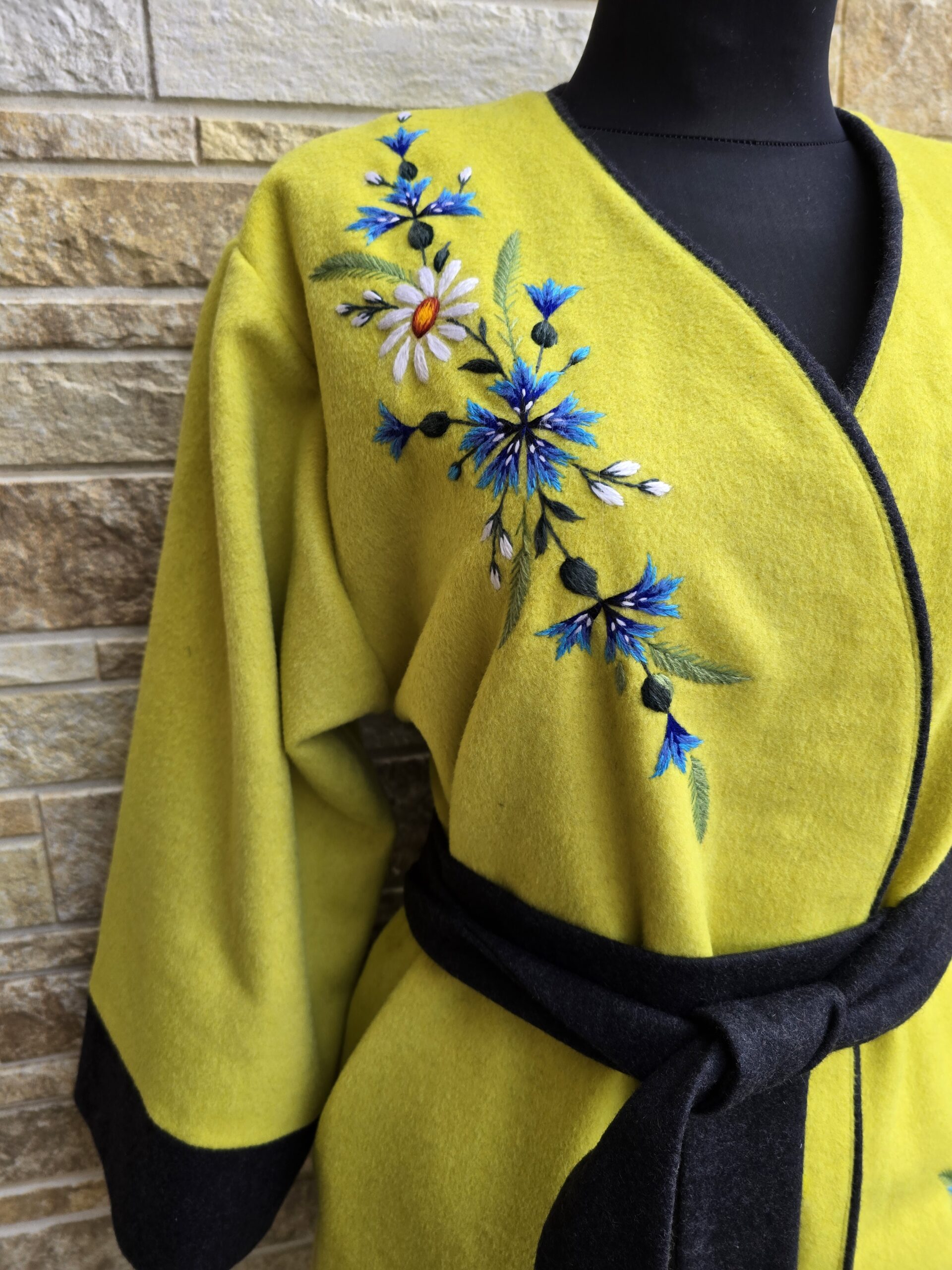 Rohekas-kollane villane käsitöötikandiga kimono suurus S.