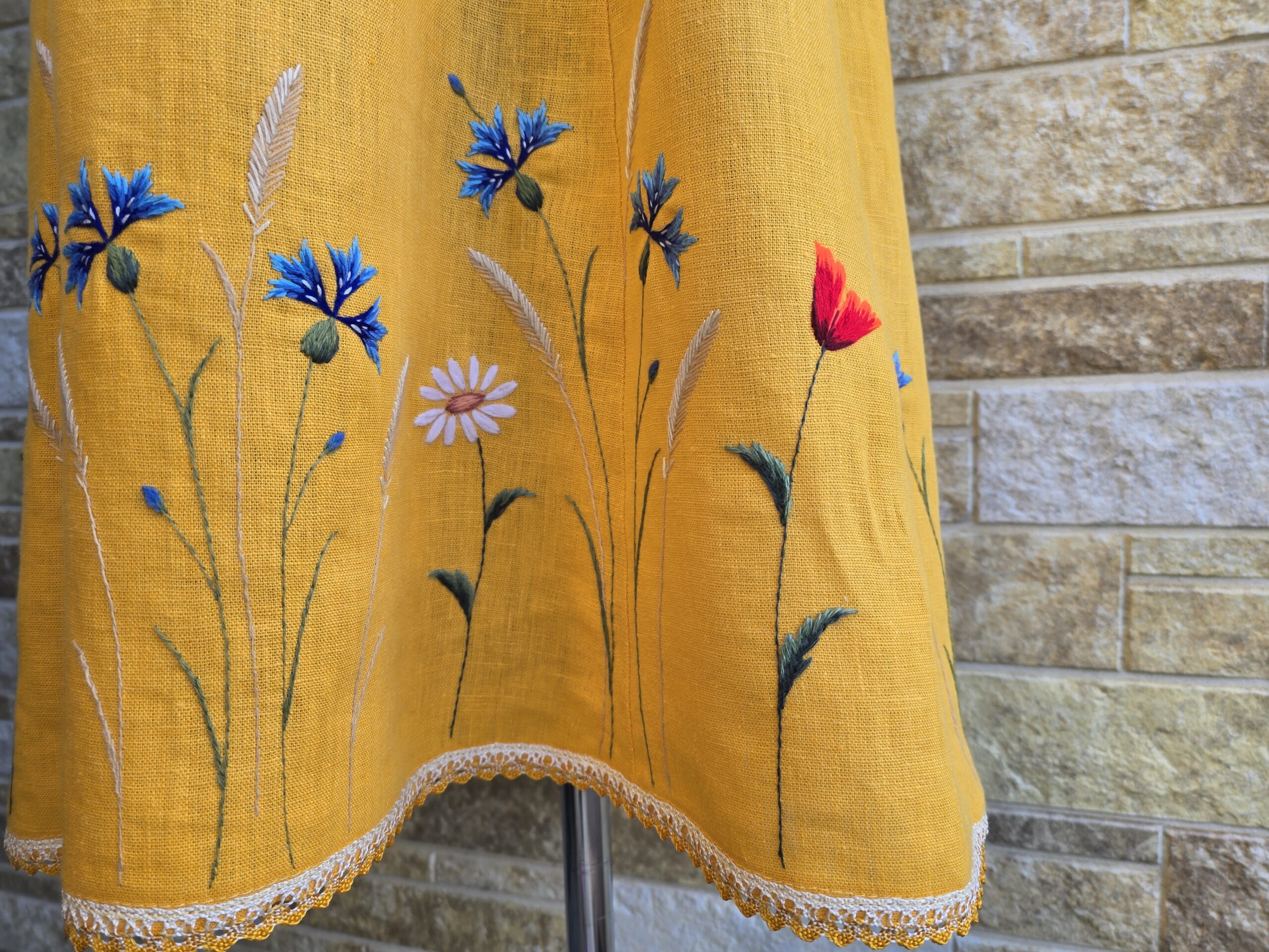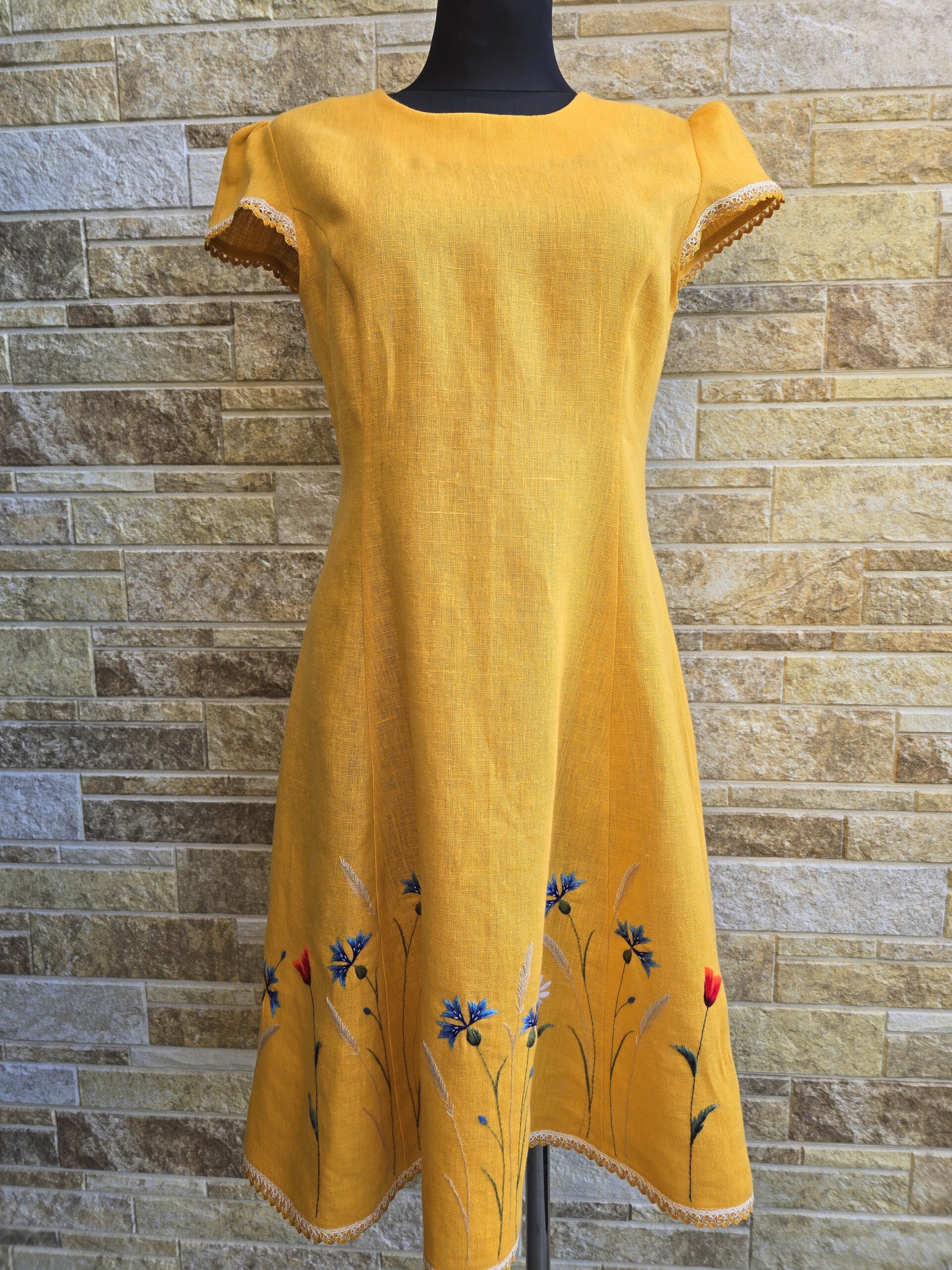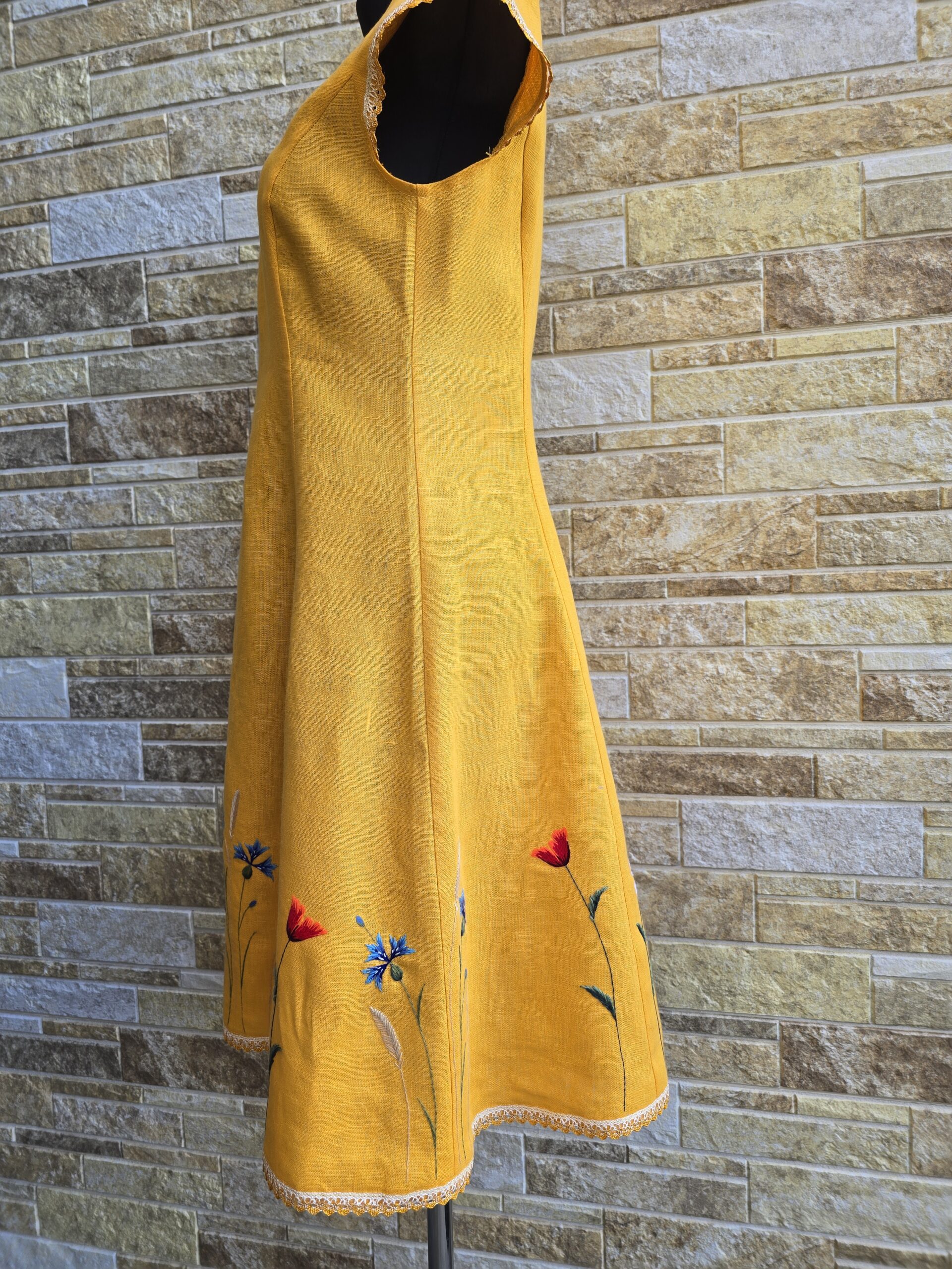 Kollane käsitöötikandiga kleit suurus S-M. Kleidil on kogu allääres, ka selja taga käsitsi tehtud tikand.