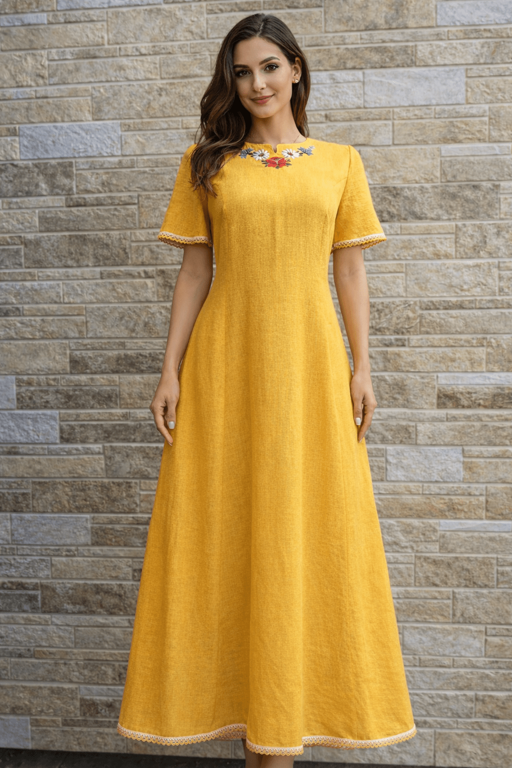 Kollane käsitöötikandiga linane kleit suurus L.