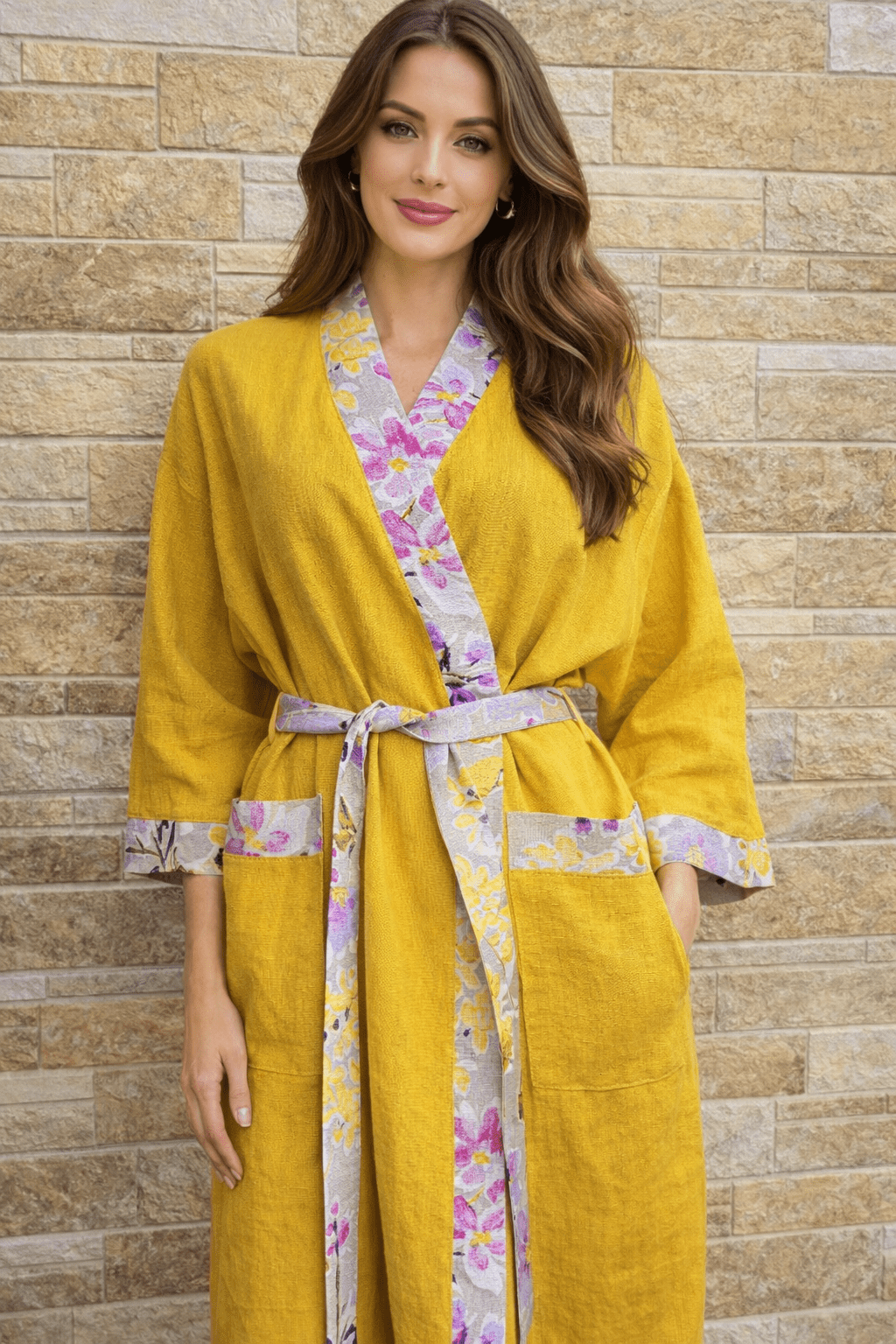 Kollane mõnus kimono kodus kandmiseks, sobib hästi ka peale sauna.