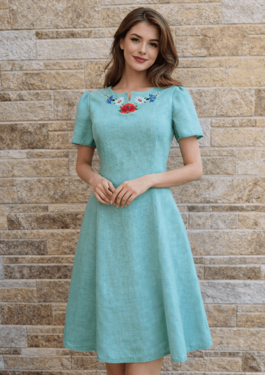 Türkiissinine linane käsitöötikandiga kleit suurus L