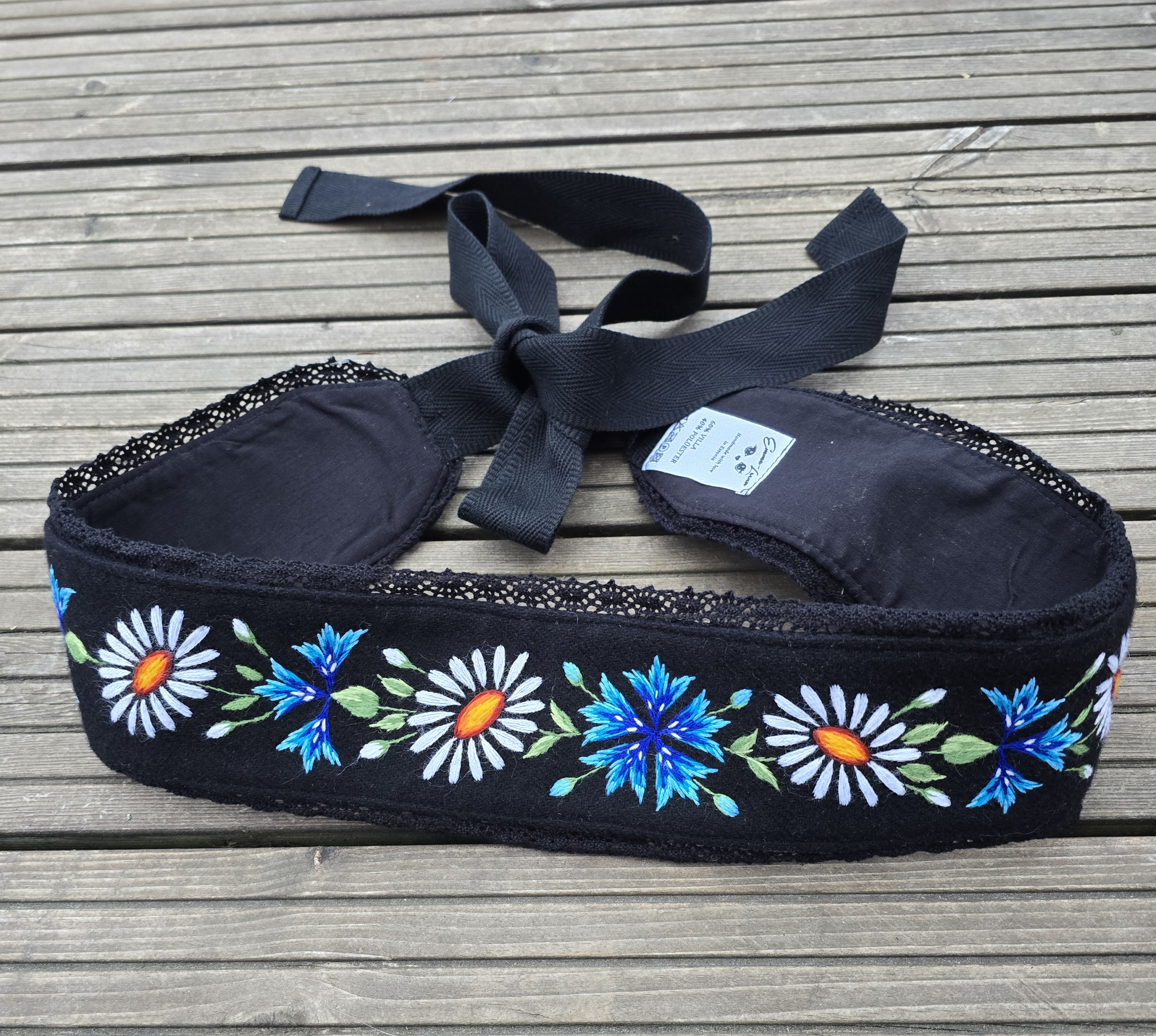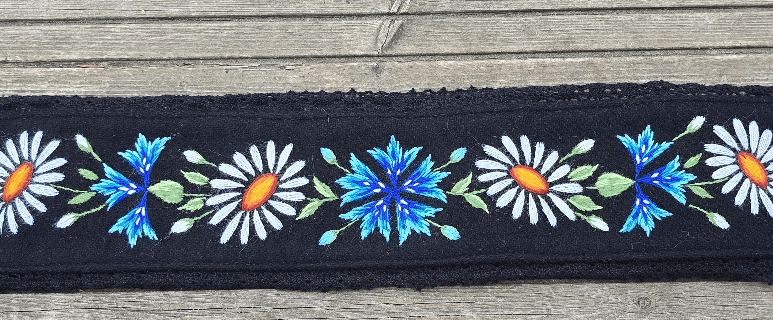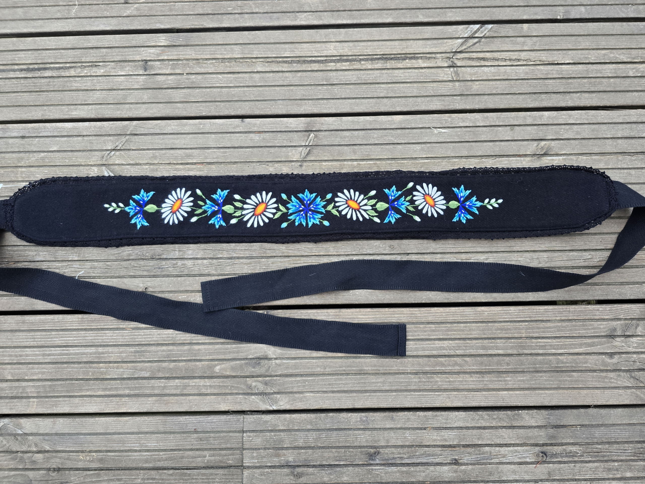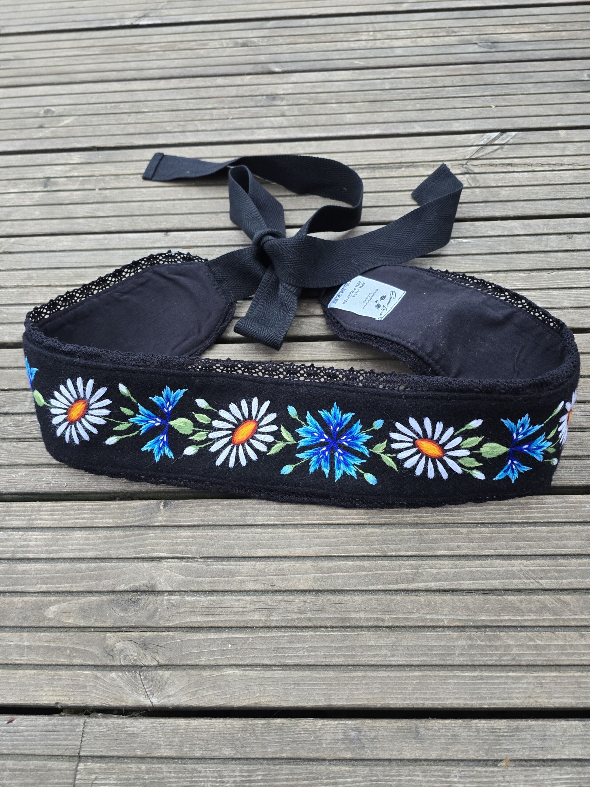 Must villane Muhu rahvusliku käsitöötikandiga vöö. Kaunis rukkilille ja karikakra tikand. Eesti käsitöö!