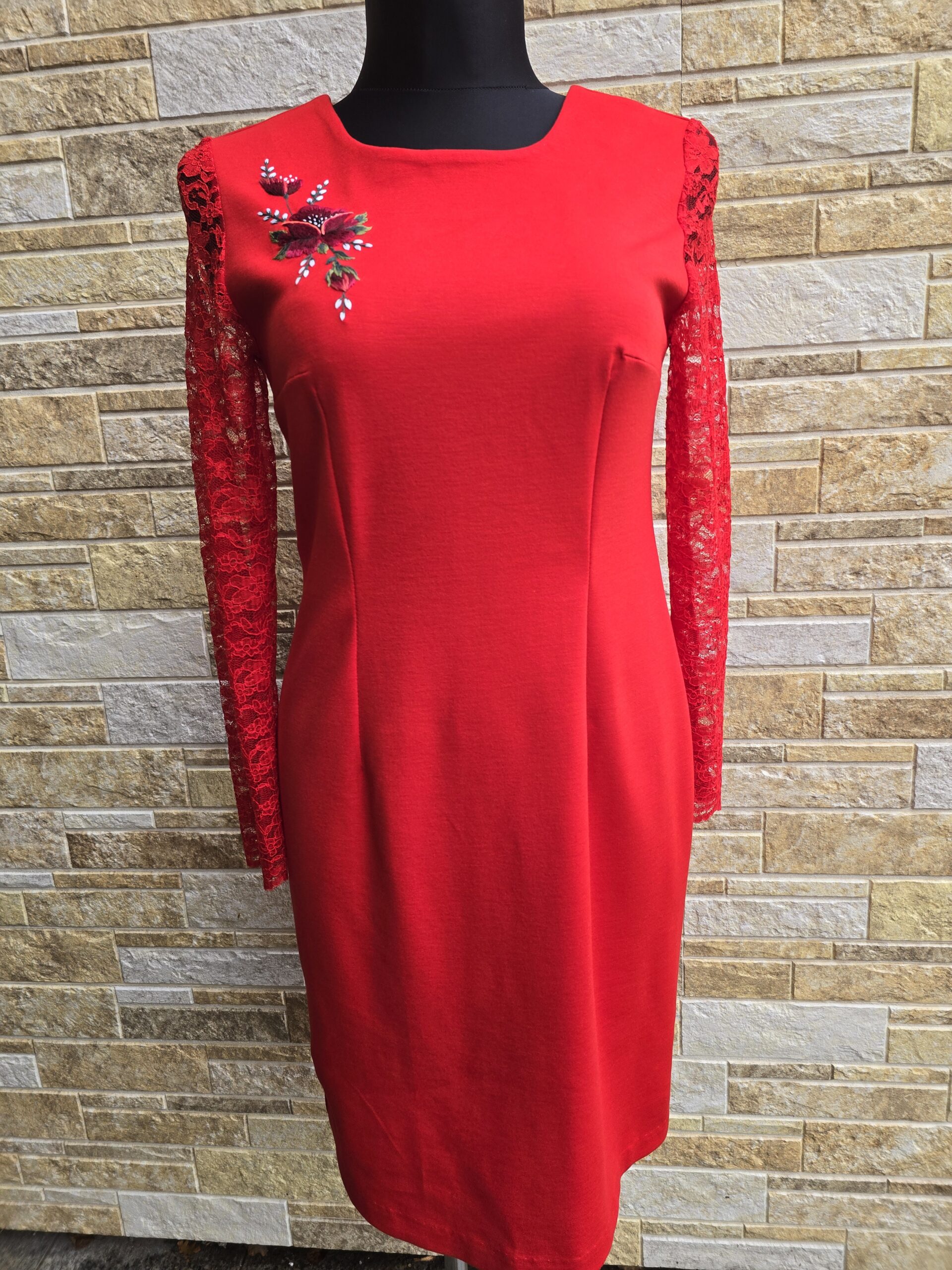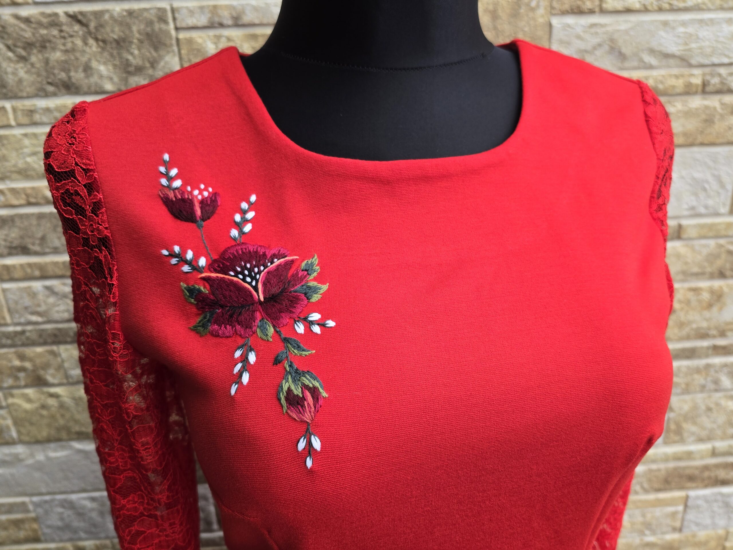 Kleidil on õlal käsitööna tehtud tikand ja taga on lõhik. Varrukad on venivast pitsist.