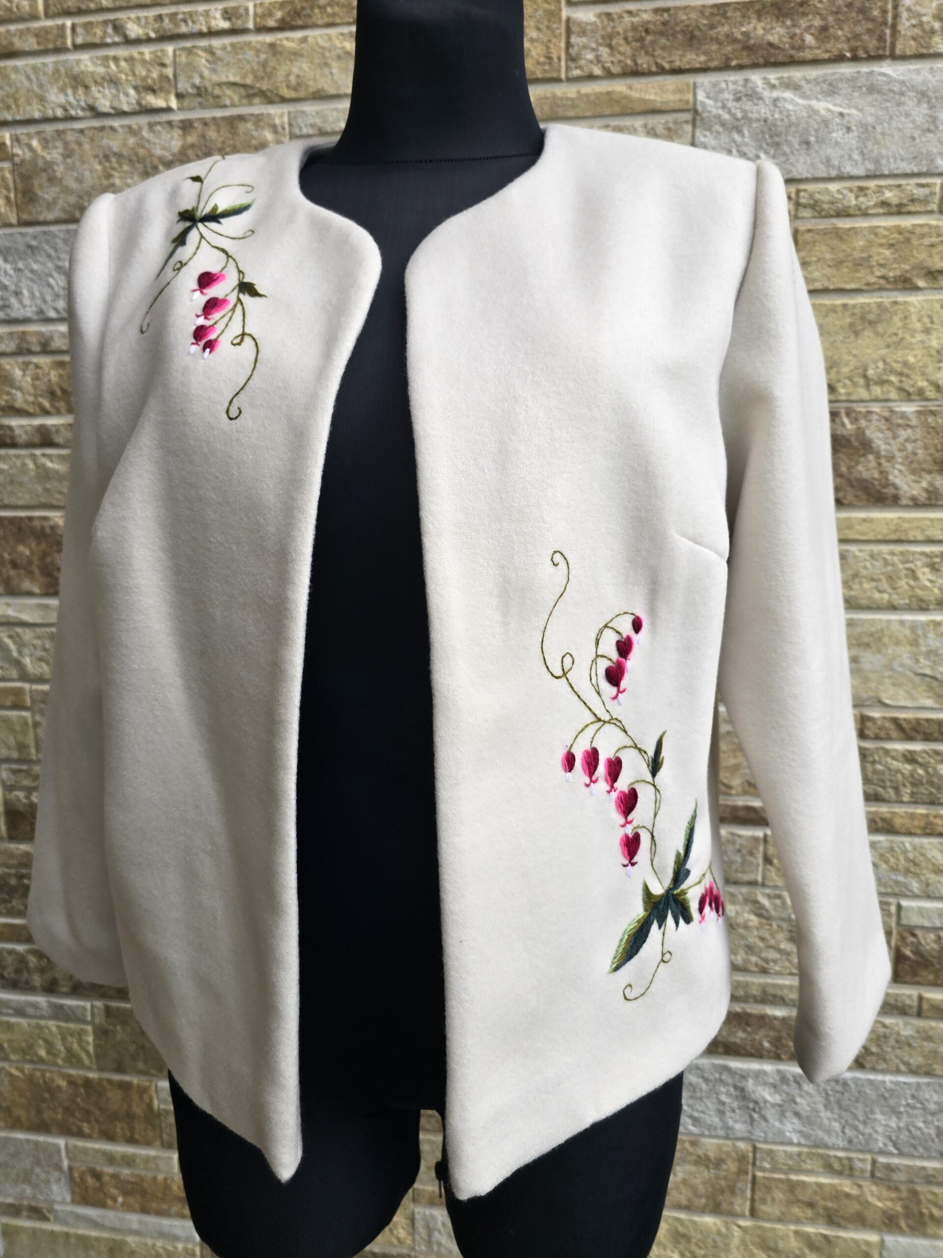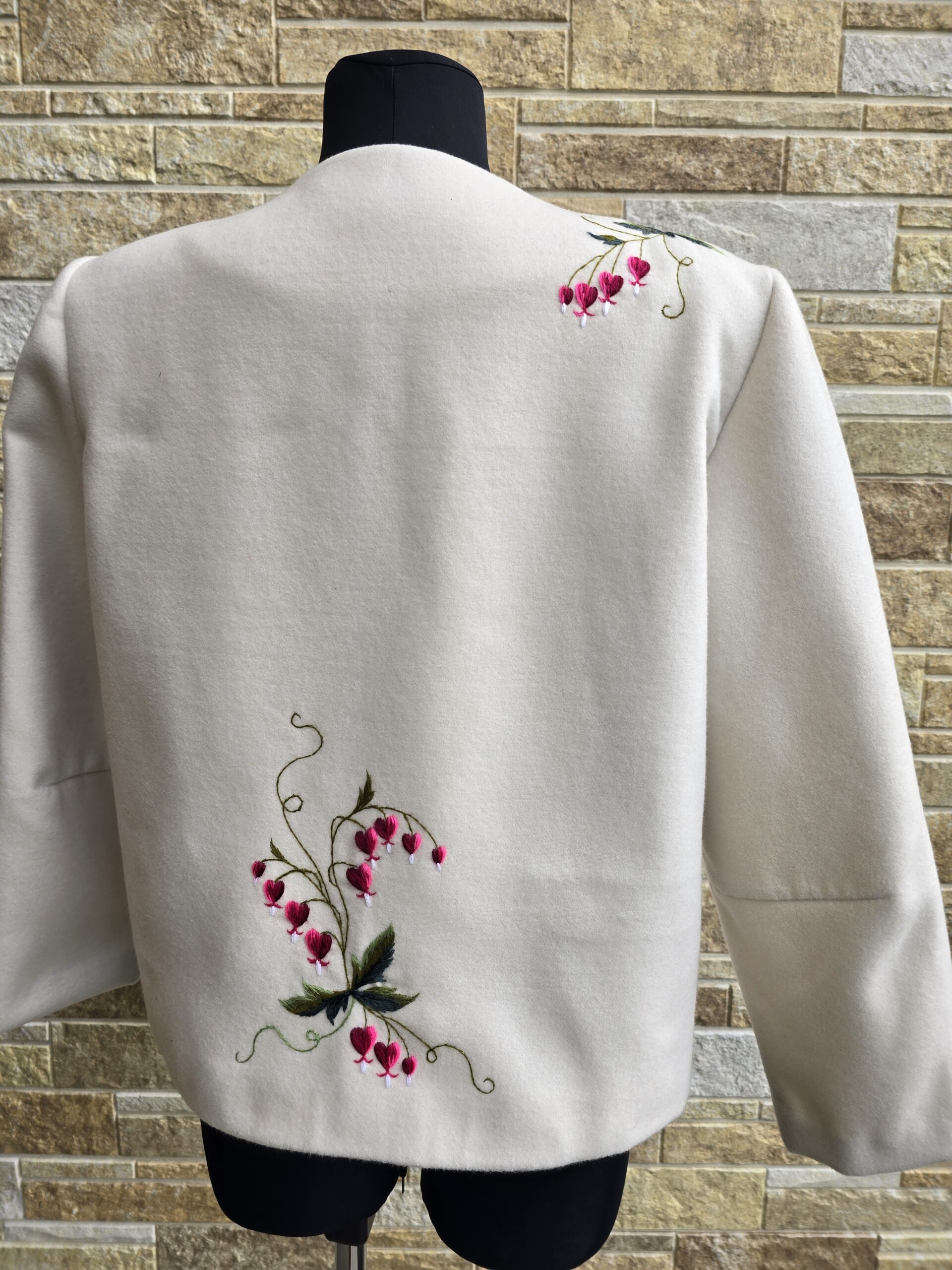 Villane lühike jakk millel käsitsi tehtud kaunid tikandit mis õlalt lähevad selja taha. Suurus S. Jakil on kehaosal viskoos vooder.