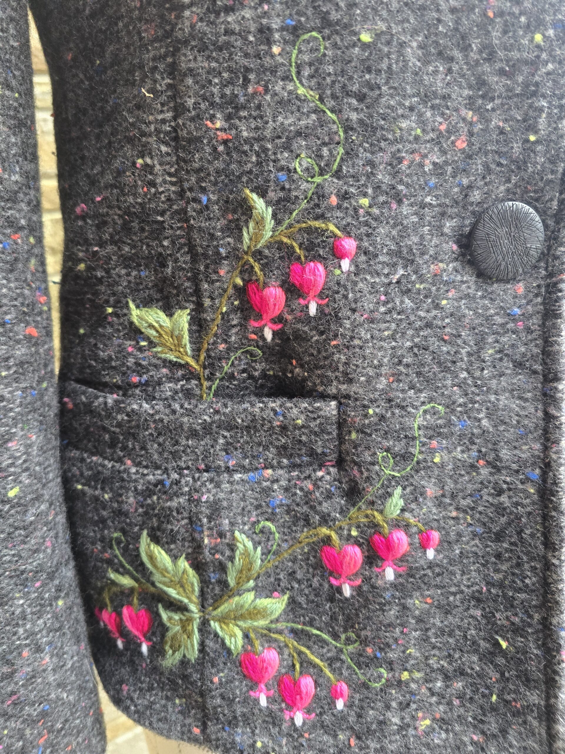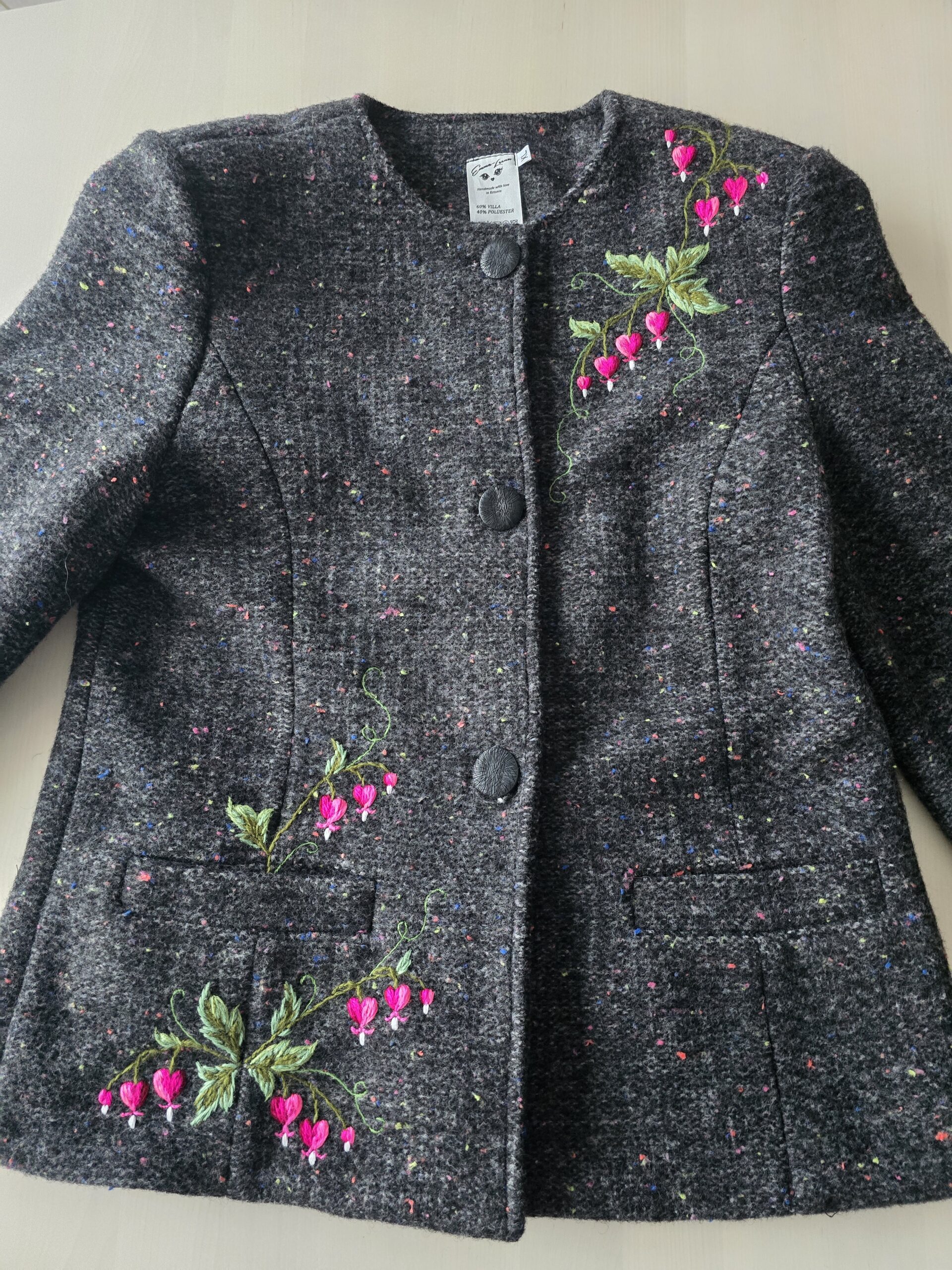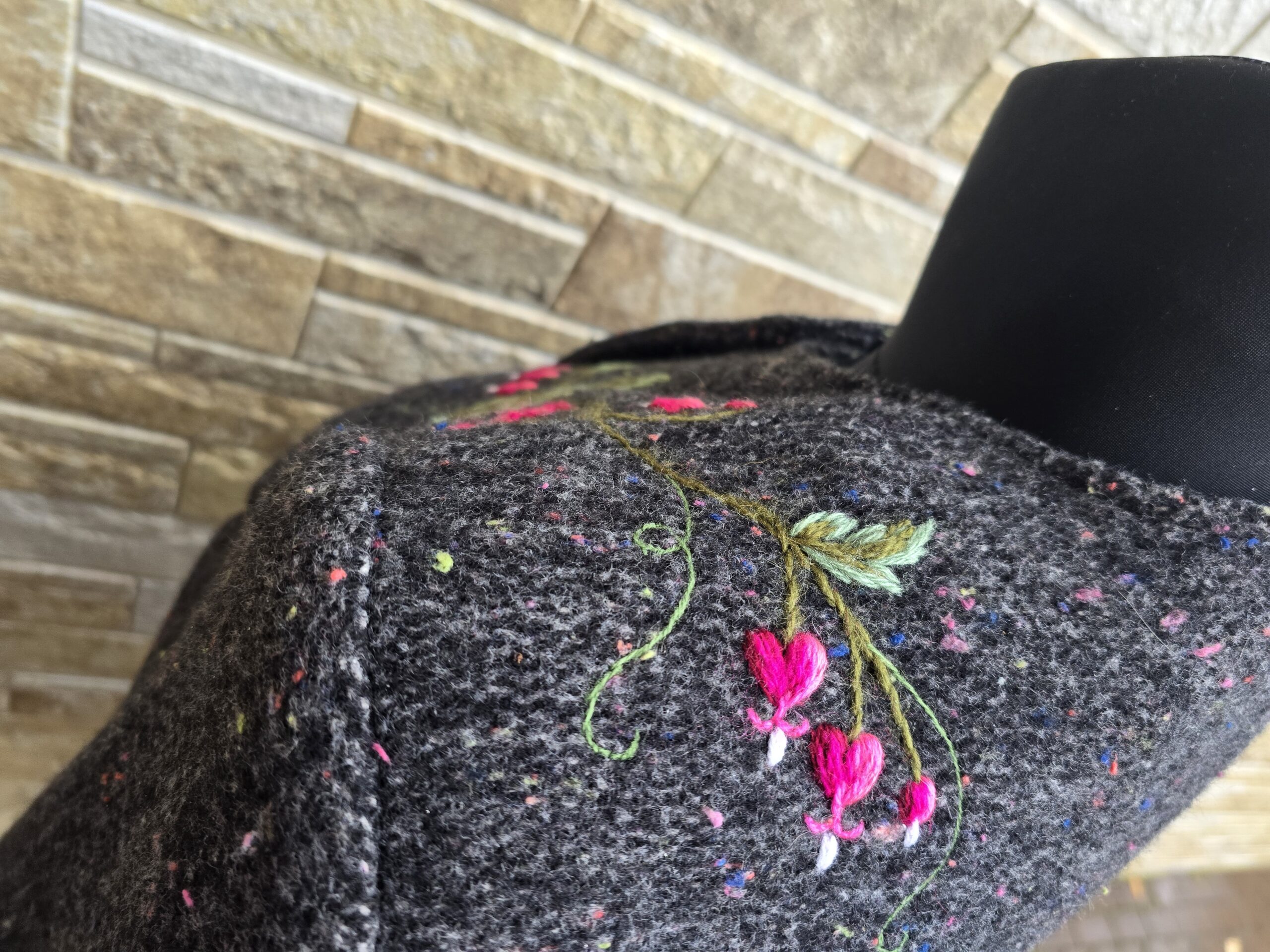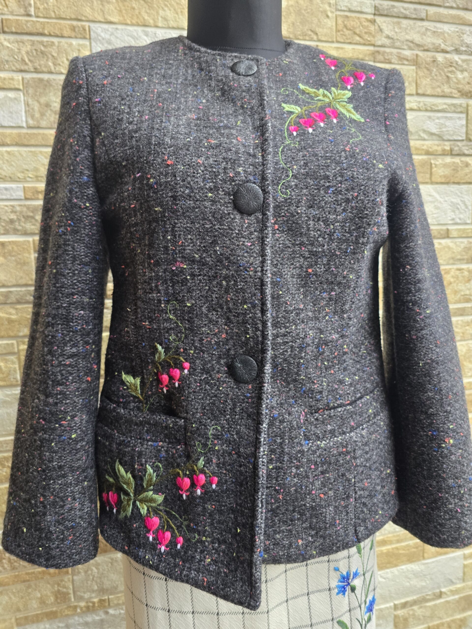 Villane jakk suurus L-XL. Jakil on imeilusad käsitsi tikitud murtud südamed mis õlalt ulatuvad ka selja taha.