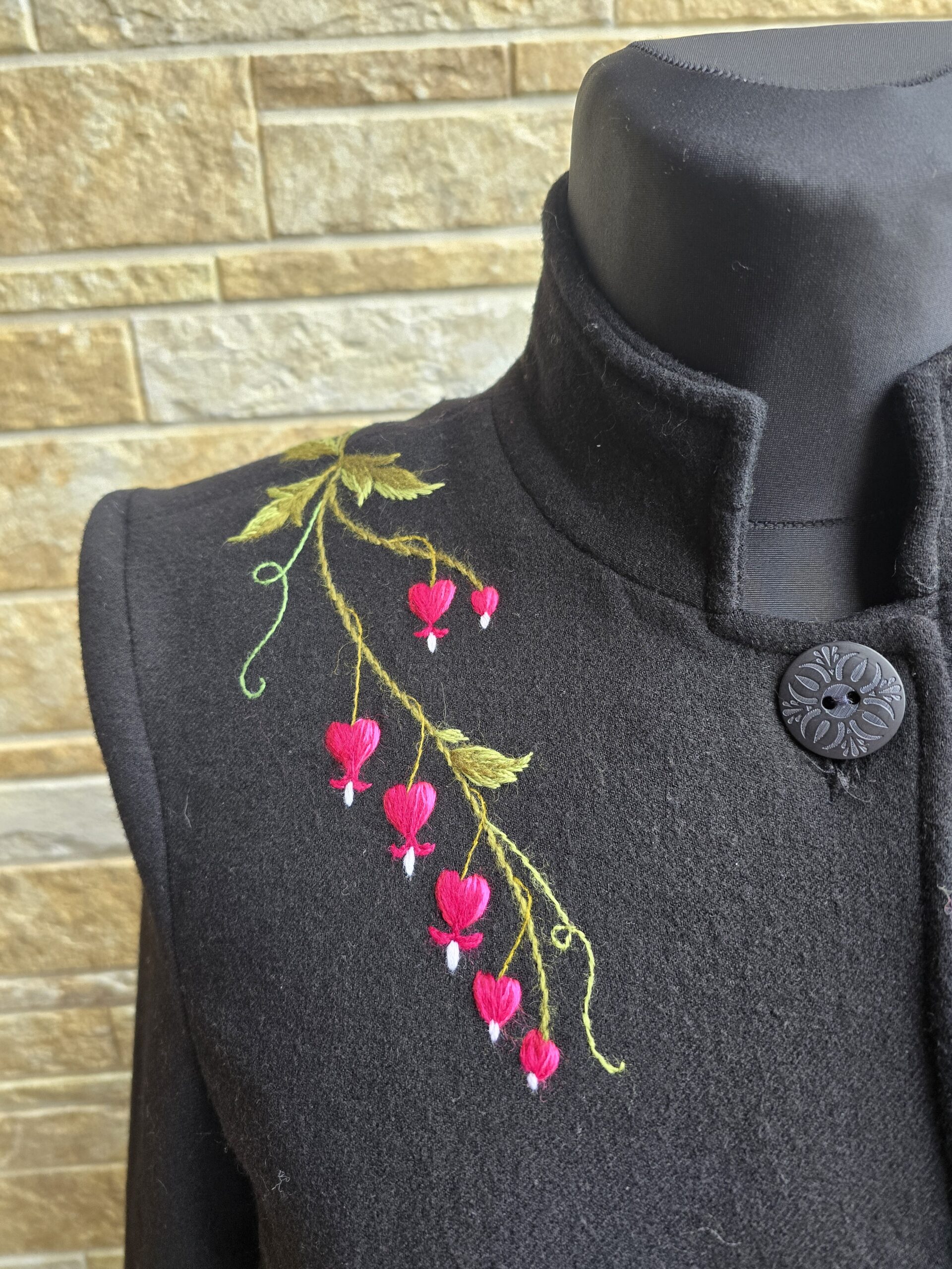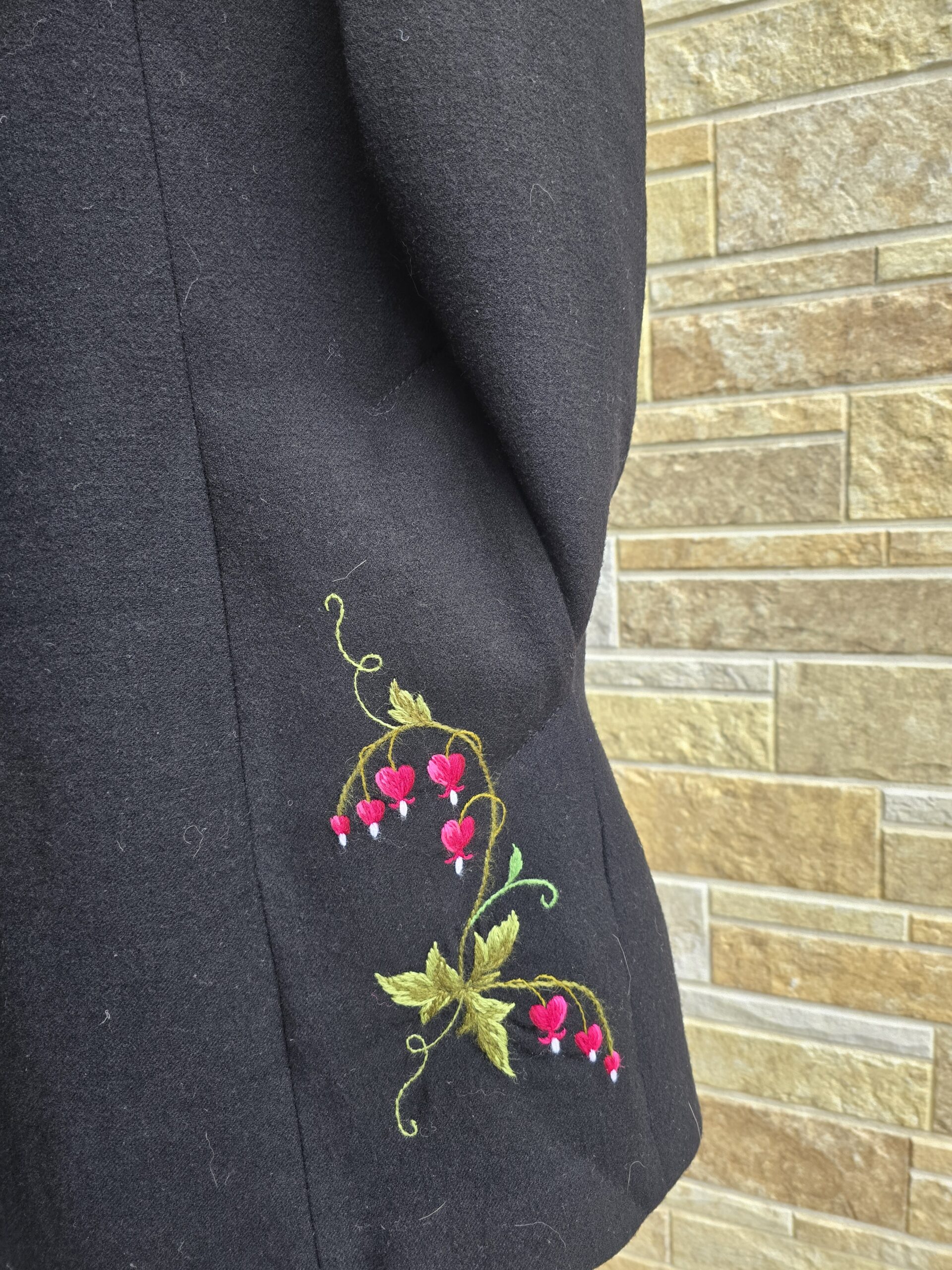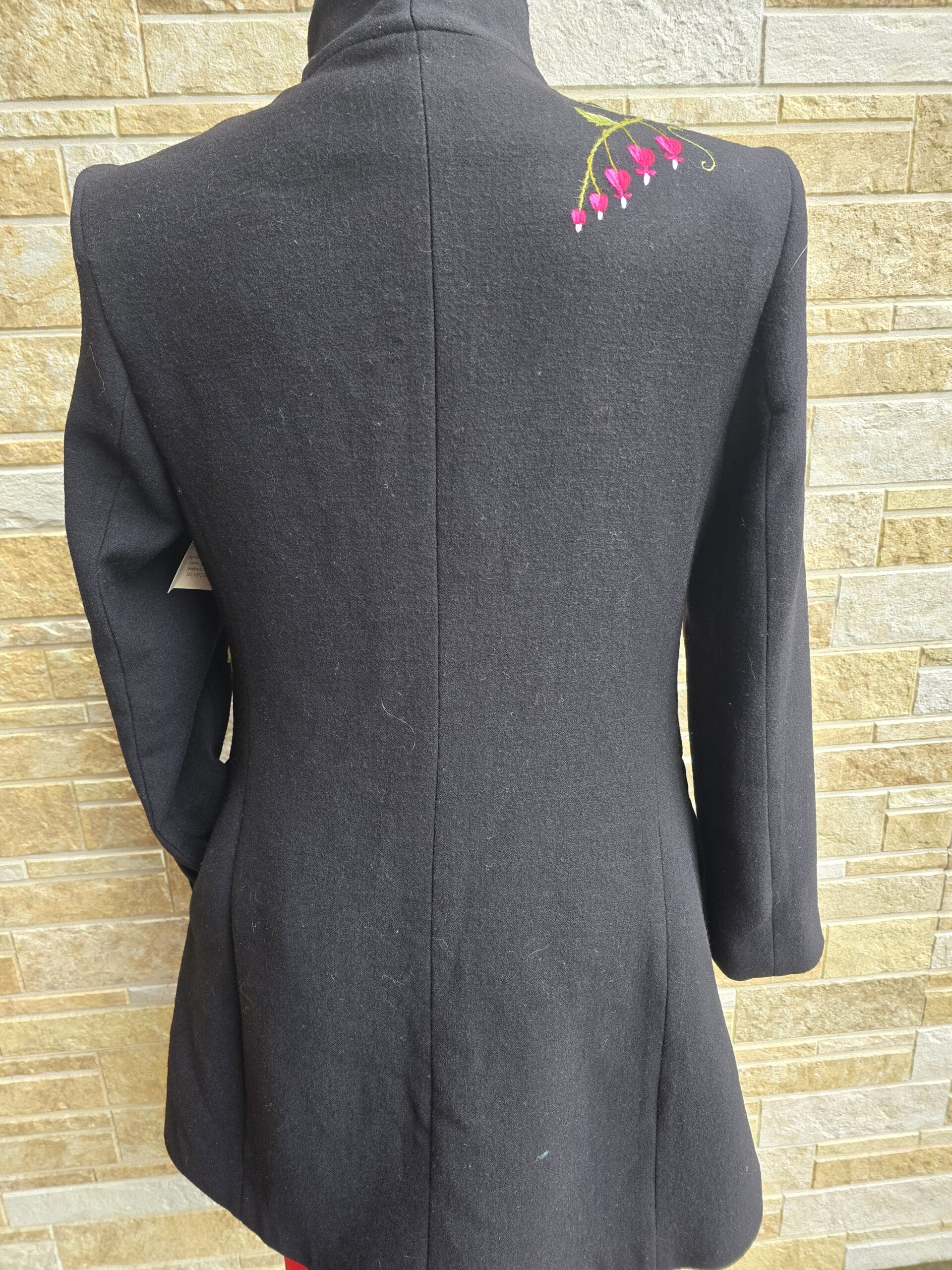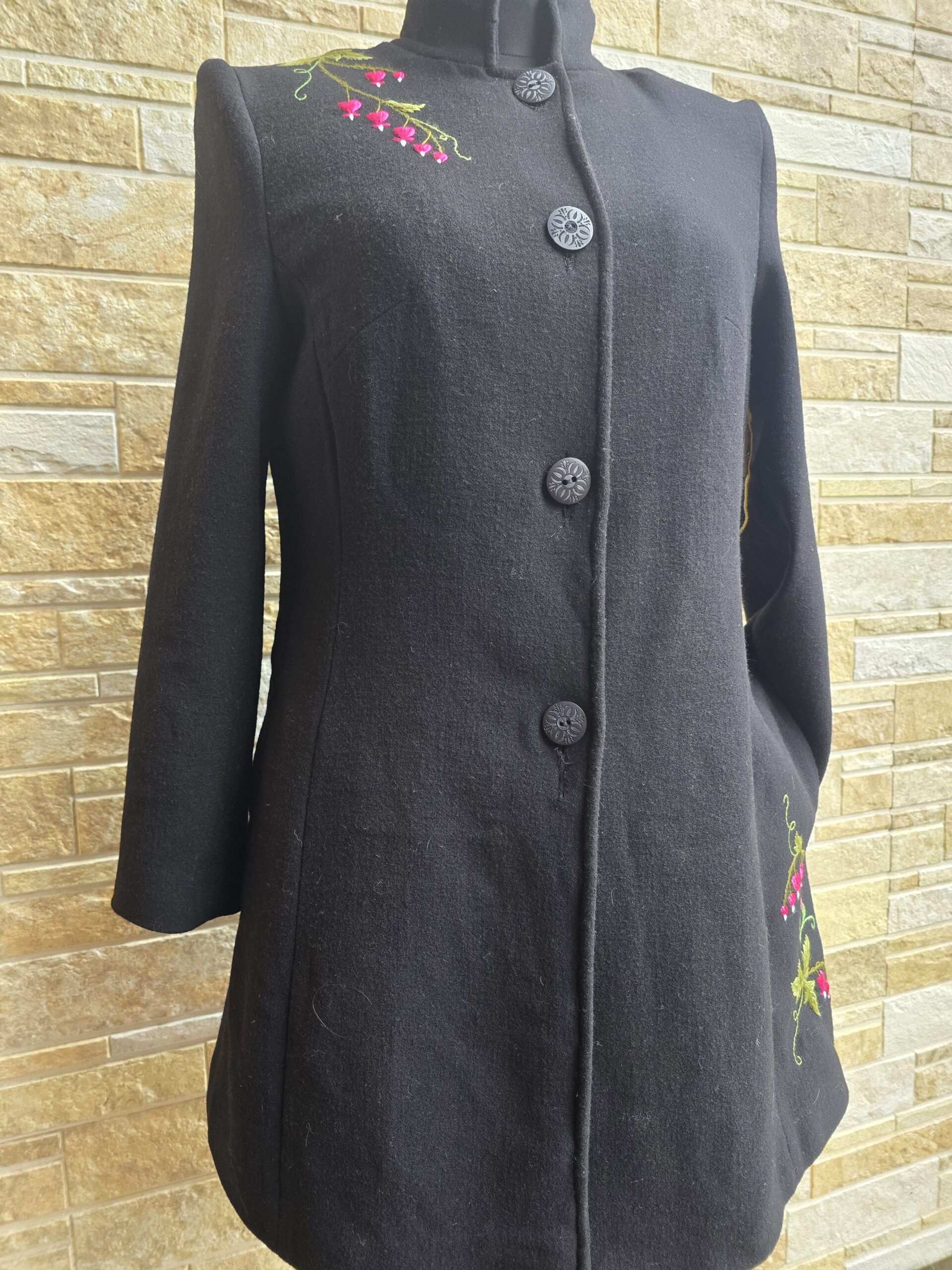 Villane musta värvi mantel imeilusate käsitsi tehtud tikanditega, suurus L. Mantlil on viskoos vooder ja küljel taskud.